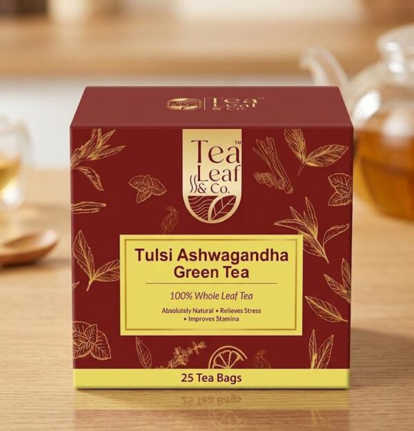 Experience a harmonious blend of wellness with Tea Leaf & Co. Tulsi Ashwagandha Green Tea. This 100% natural, whole-leaf blend combines the revitalizing power of Green Tea with the ancient healing properties of Tulsi (Holy Basil) and Ashwagandha to rejuvenate your mind and body.